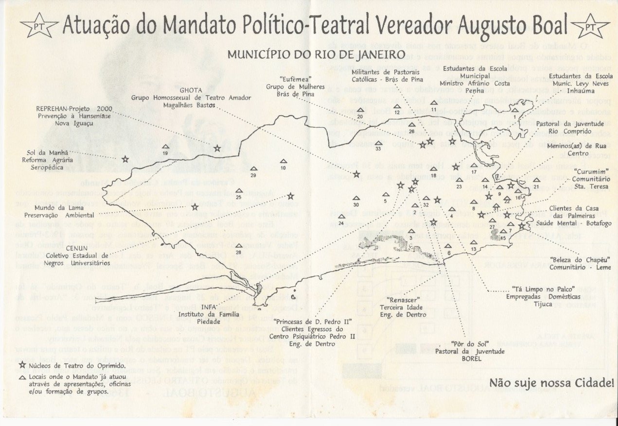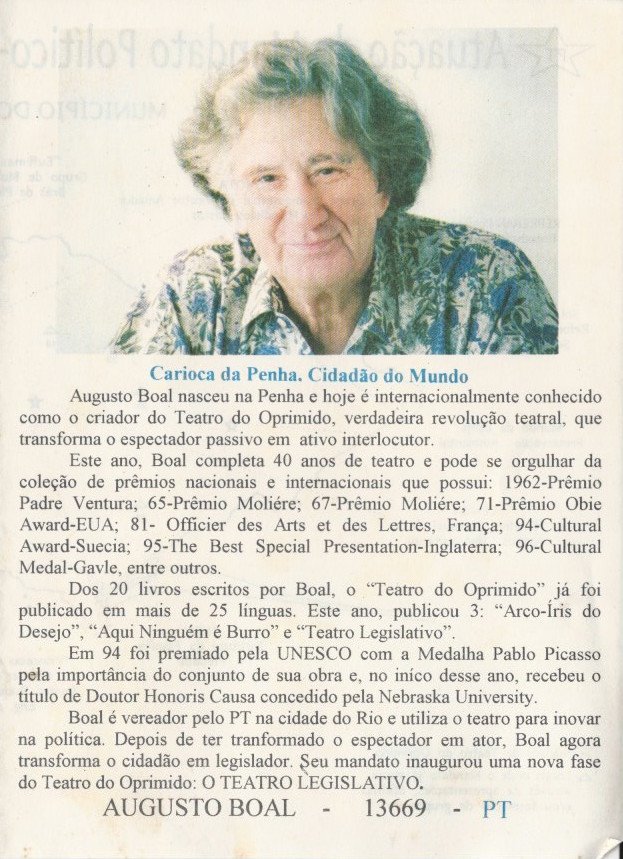 No início da década de 1990, Augusto Boal foi vereador do Rio de Janeiro pelo Partido dos Trabalhadores (PT).